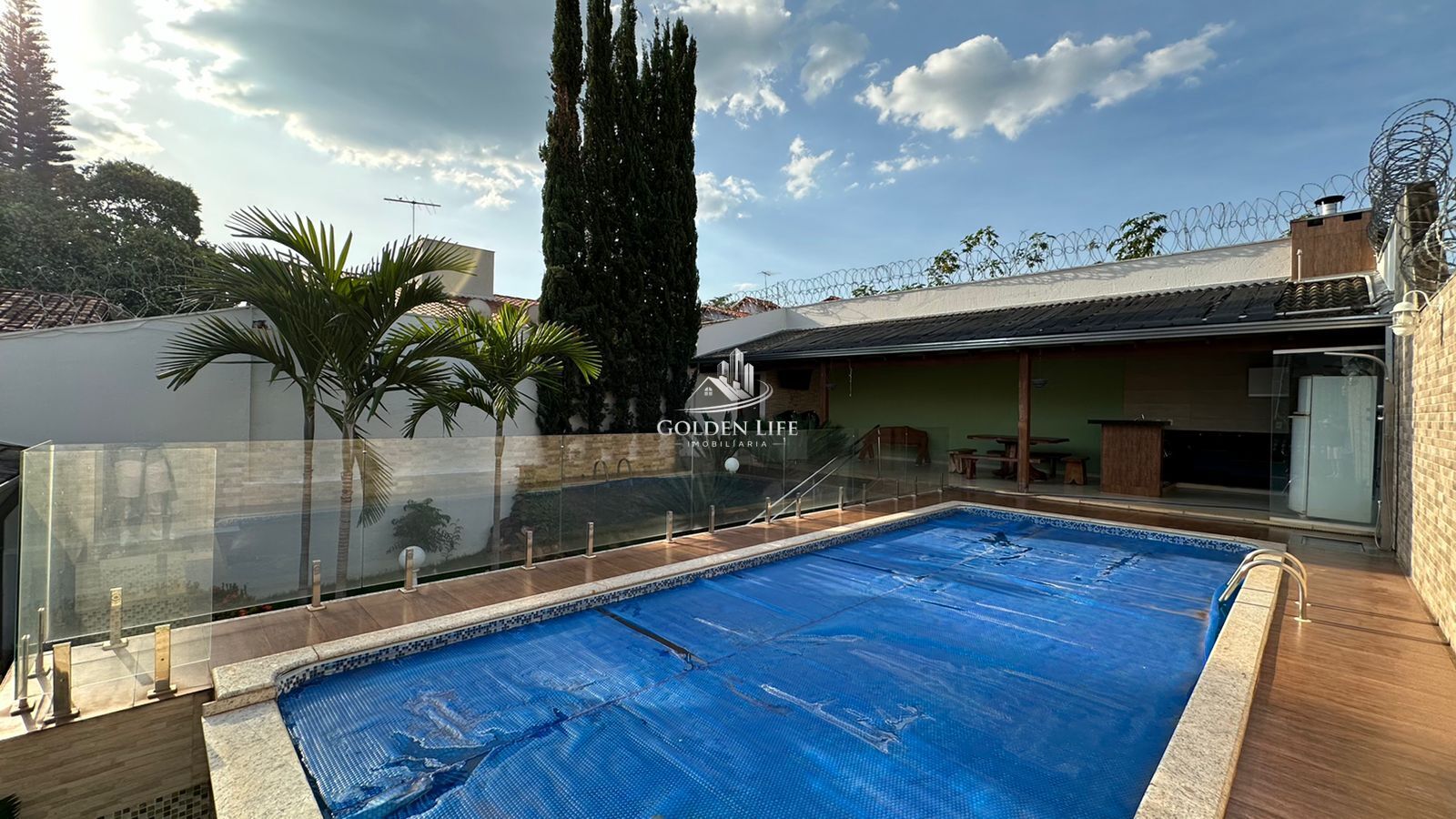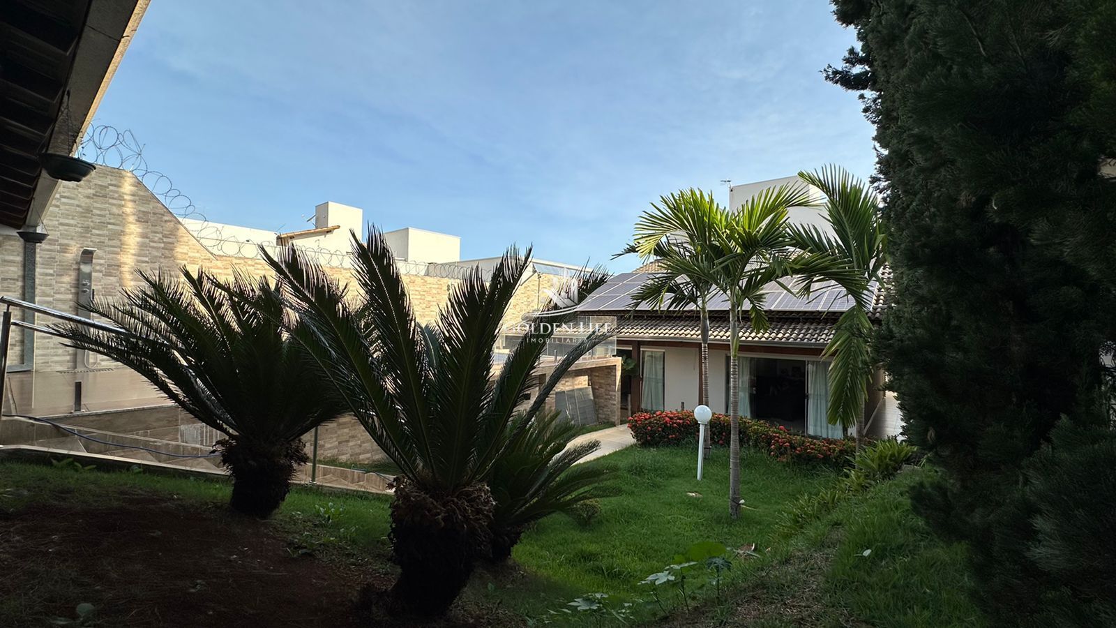 O imóvel conta com quatro quartos, sendo duas semi-suítes no piso inferior, uma suíte master no piso superior com closet, hidromassagem e varanda, além de um quarto com varanda. Possui escritório, sala de estar em dois ambientes integrada à cozinha, varanda gourmet ampla com piscina, churrasqueira e paisagismo. Dispõe de ar-condicionado em três quartos, aquecimento solar, energia solar, sistema de câmeras de segurança e vaga para três carros.