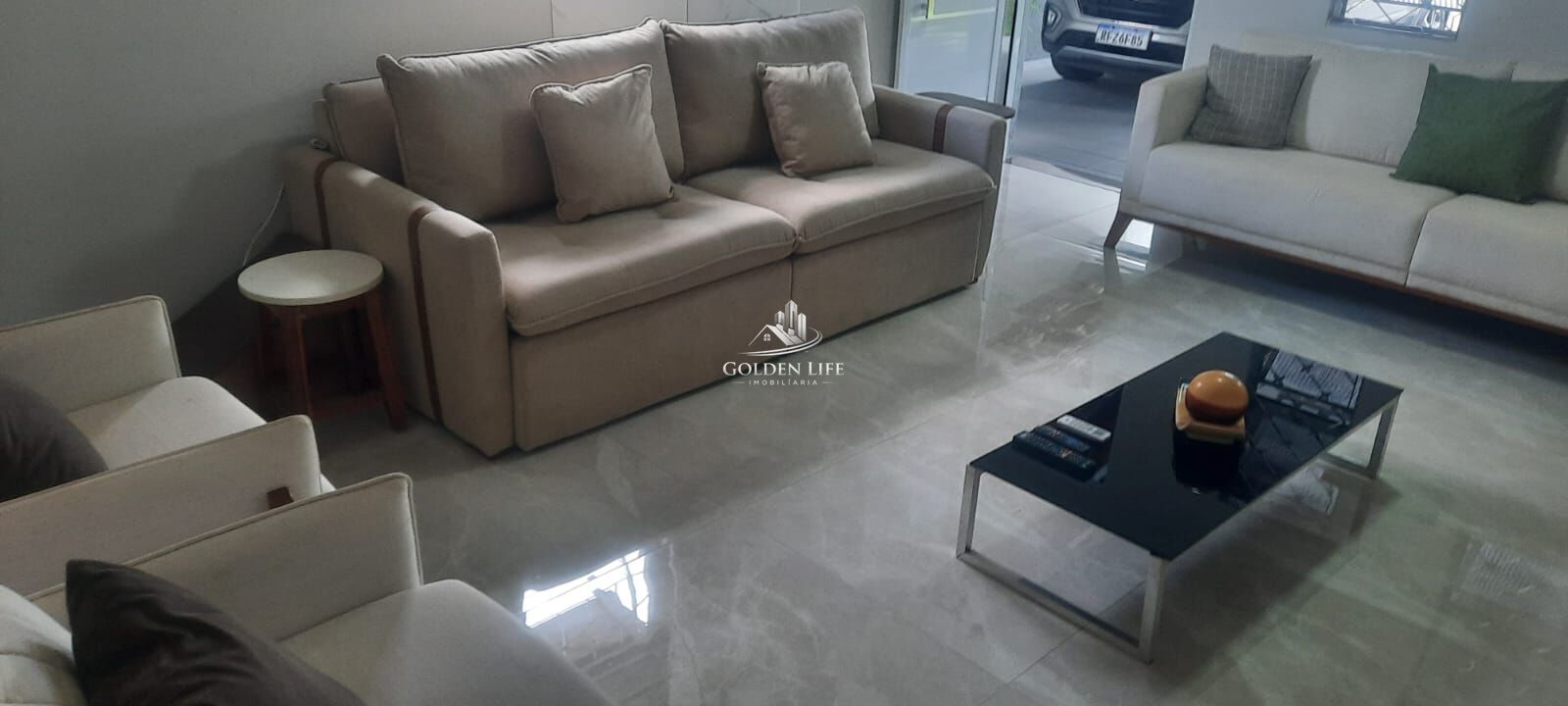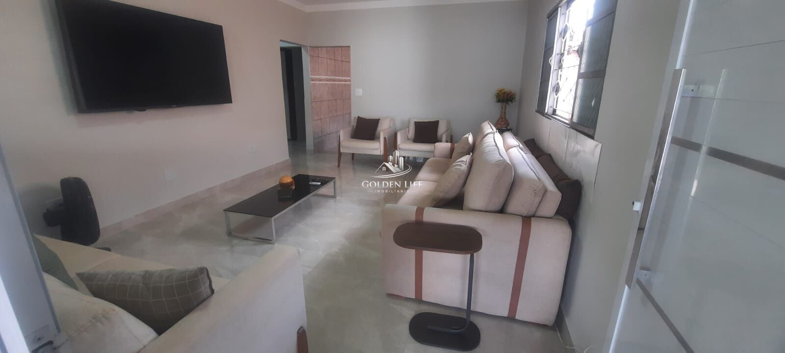 Sala ampla, com fino acabamento e porcelanato 84 x 84, proporcionando elegância e sofisticação